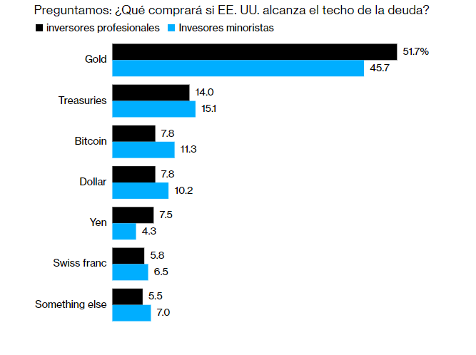 Más del 50% de los profesionales de las finanzas comprarán oro si el gobierno estadounidense no logra evitar un impago de la deuda. Los bonos del Tesoro estadounidense ocuparían el segundo lugar, y Bitcoin sería la tercera alternativa más popular entre los inversores minoristas.