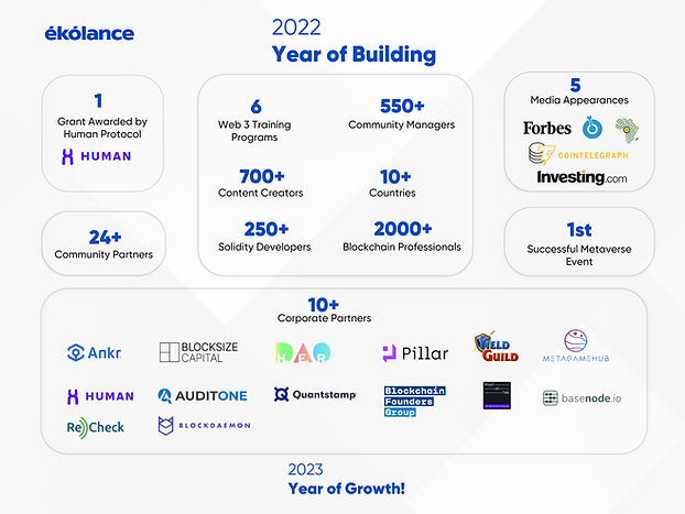 Desde el inicio de Ekolance, nos hemos asociado con más de 10 empresas de blockchain para organizar hackatones y contratar profesionales de nuestro grupo de talentos. Desde el punto de vista de la comunidad, nos hemos asociado con más de 24 comunidades de blockchain para ofrecer capacitación Web3 estructurada a los miembros de su comunidad.
