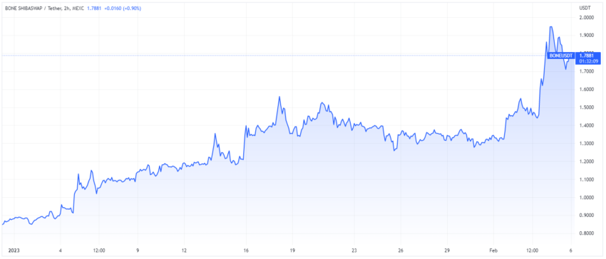 El token BONE ha aumentado un 120% en lo que va de año, pasando de 0.873 dólares a casi 1.95 dólares. Ese es un salto masivo, con gran parte de ese rendimiento a principios de febrero.