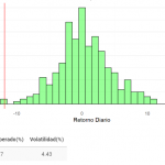 En el gráfico anterior (Retorno diario de bitcoin base 1 año) , podemos encontrarnos con una volatilidad promedio en bitcoin de un 4,43%, el movimiento natural de bitcoin, a la fecha. El retorno positivo o negativo, se acrecienta en relación a, cuanto más nos acercamos a 0, más veces, ocurre.