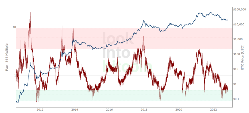 Y para poner un ejemplo práctico, tenemos un análisis onchain llamado “Puell Multiple”, en bitcoin (con fecha de 31 de octubre de 2022 se muestra dicho gráfico). Esta métrica onchain analiza el lado de la oferta de la economía de Bitcoin: los mineros de bitcoin y sus ingresos. Un punto muy importante, recordando que la recompensa del bloque que se emite cada casi 10 minutos, es lo que los mineros, como trabajadores que son, ganan.