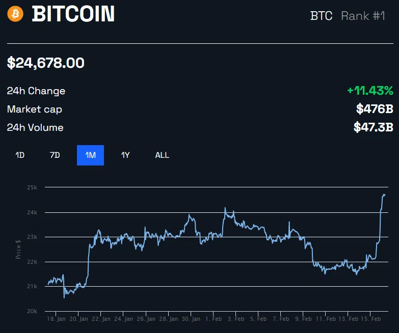 Los precios de Bitcoin se han visto impulsados por esta rara porción de FOMO. En el momento de la publicación, el activo subió 11,4% en el día para llegar a 24,681 dólares. Este es su precio más alto desde mediados de junio de 2022, hace unos ocho meses.