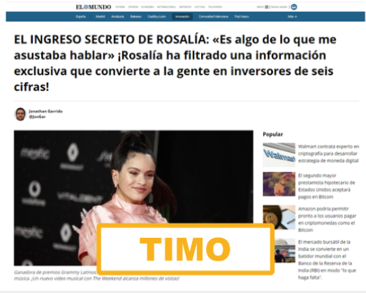 Sin embargo el anuncio no es más que un scam orientada a atrapar incautos. Cómo ya mencionó el medio especializado Maldita.es la supuesta entrevista con la artista Rosalía no es real y suplanta a la web de el medio español El Mundo.