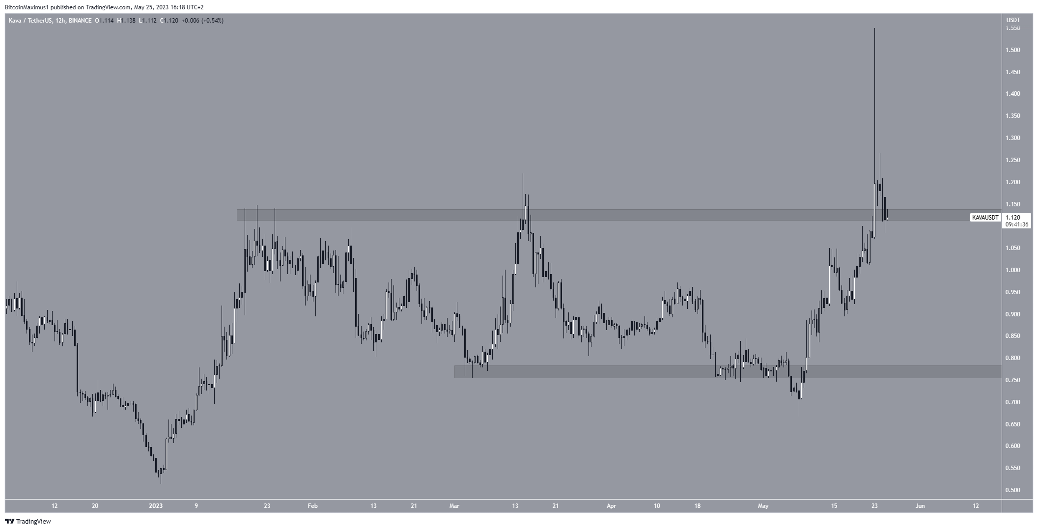El precio de KAVA ha aumentado rápidamente desde un mínimo de 0.66 dólares el 8 de mayo. El movimiento alcista se aceleró el 23 de mayo, lo que llevó a un máximo de 1.55 dólares el mismo día, provocando una ruptura desde el área de resistencia de 1.10 dólares.