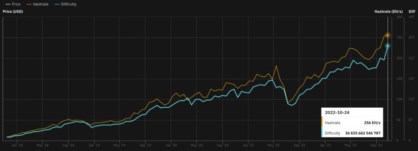 Según estadísticas de Braiins, el hashrate acumulado por los mineros de Bitcoin ha llegado a 256 exahashes por segundo (EH/s), y la dificultad de minado (la cual tuvo un ajuste el día de ayer) alcanzó los 36 T.