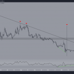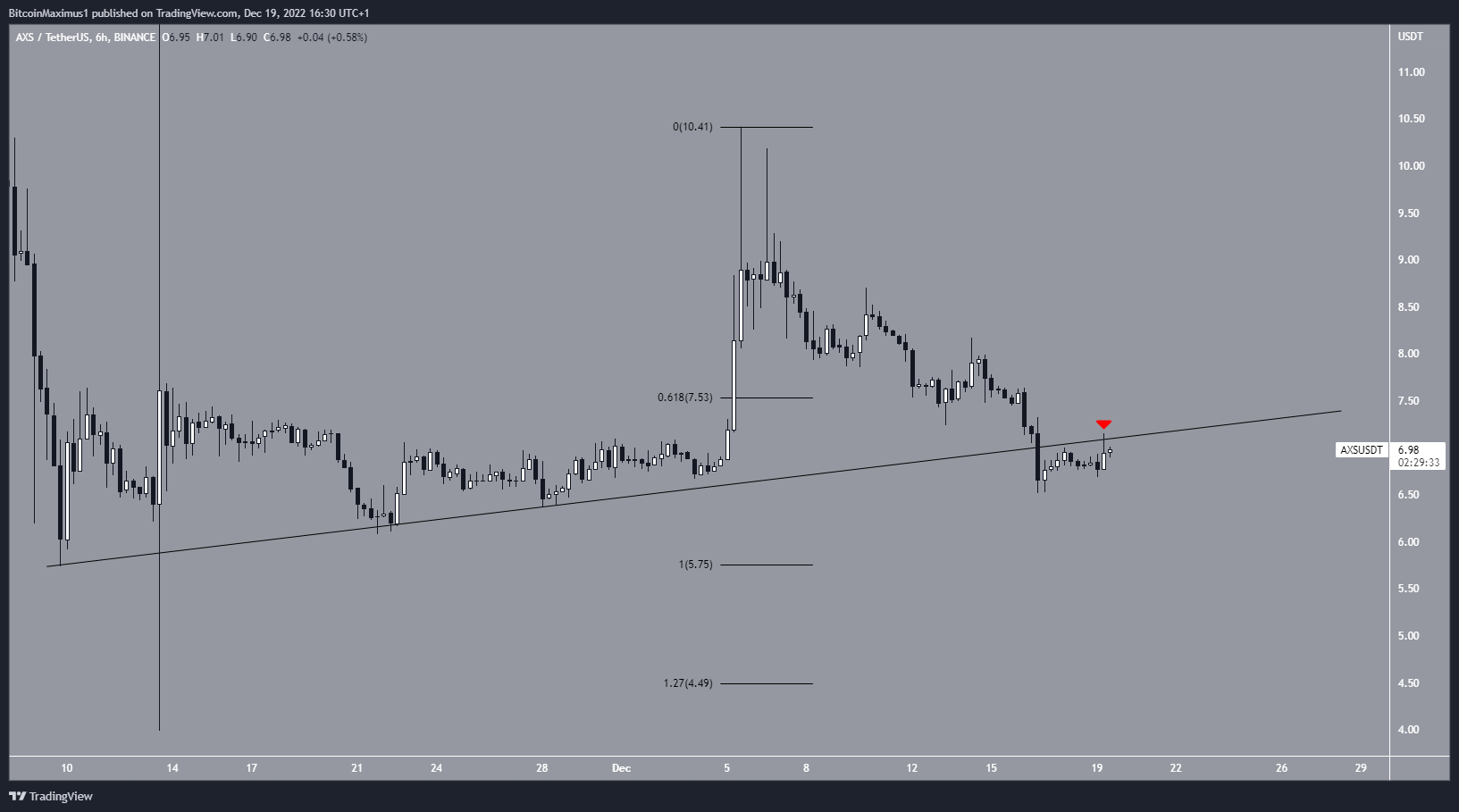 Si bien existe ambigüedad en cuanto a la dirección de la tendencia en el marco de tiempo diario, el gráfico de seis horas es bajista. Muestra que el precio de Axie salió de una línea de soporte ascendente. Durante las últimas 24 horas ha estado en proceso de validación como resistencia (icono rojo).