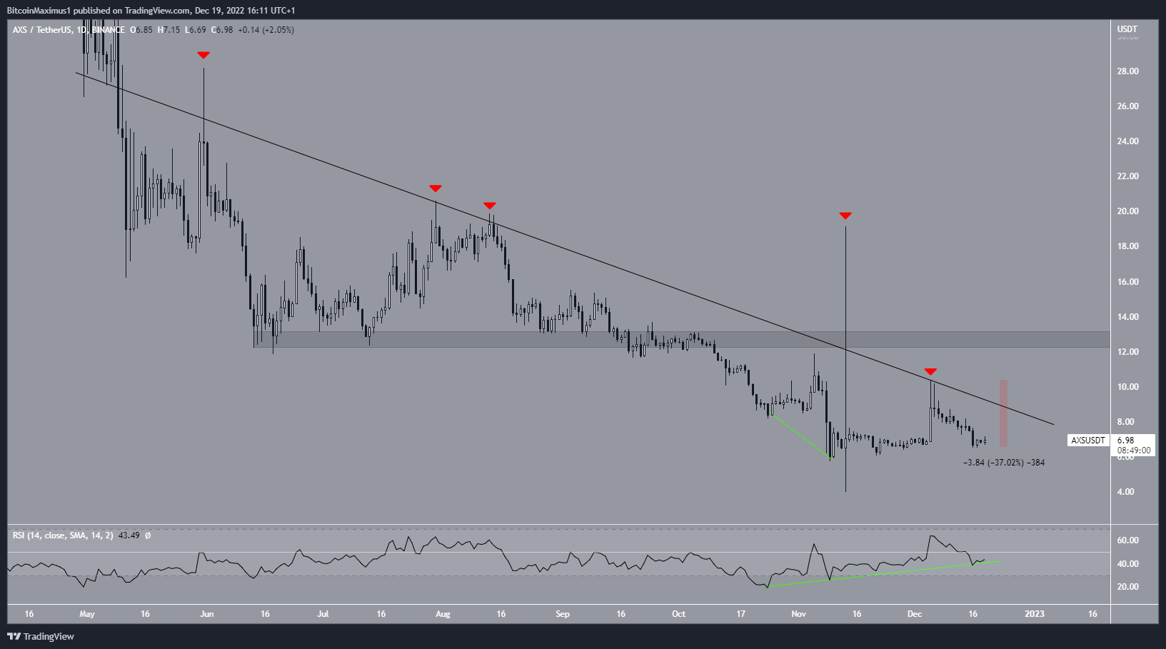 Si bien el precio de Axie Infinity (AXS) ha generado una divergencia alcista, aún debe confirmarlo rompiendo una línea de resistencia descendente. Hacerlo podría catalizar un movimiento ascendente.