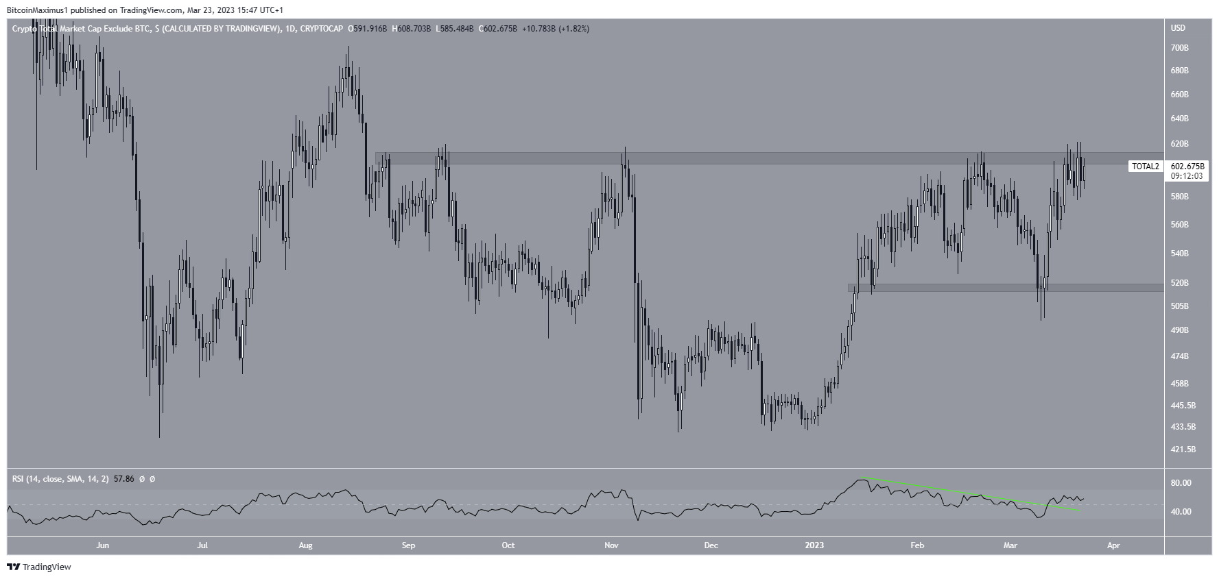 Al excluir Bitcoin (BTC), la capitalización de mercado de las altcoins (ALTCAP) se cotiza en el área de resistencia de 605 mil millones de dólares. Si bien ALTCAP aumentó por encima de él varias veces, no logró cerrar por encima del área.