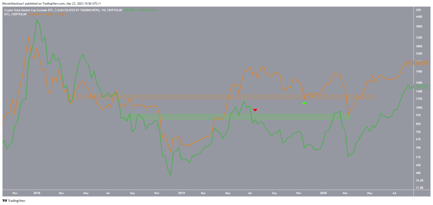 En cualquier caso, se han presentado casos en el pasado en los que el precio de Bitcoin superó un área de resistencia clave (iconos verdes) mientras que la capitalización de mercado de las altcoins (verde) cayó por debajo de un nivel de soporte (icono rojo).