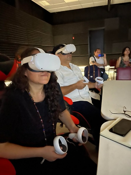 La comisión evaluadora, utilizando lentes de realidad virtual, pudo explorar un museo en 3D que expone la historia del metaverso, una línea de tiempo de los hitos principales asociados a este campo, y material multimedia dispuesto en diferentes salas.