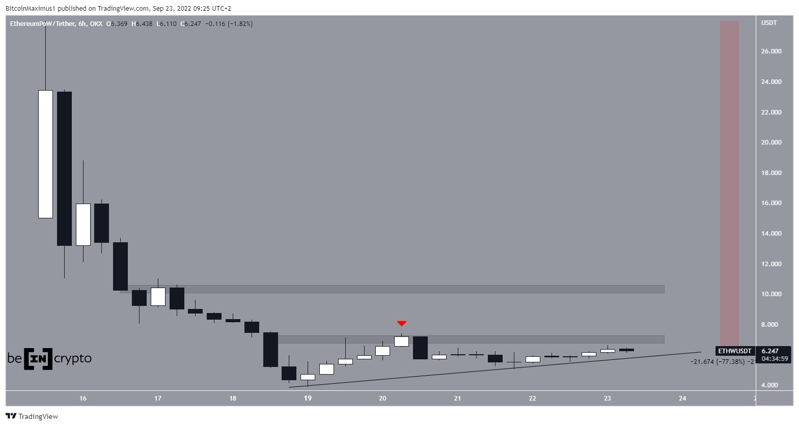 ETHW ha estado cayendo bruscamente desde la Fusión y actualmente está un 77% por debajo de su precio máximo histórico de 27.99 dólares. Por el contrario, el precio se ha estado moviendo hacia arriba desde sus mínimos del 19 de septiembre, pero fue rechazado por el área de resistencia horizontal de 7 dólares (icono rojo).
