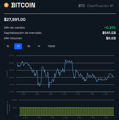 En los últimos 30 días, el precio de Bitcoin ha aumentado un 29% y, al momento de la publicación, cotiza cerca de los 28,000 dólares, con una capitalización de mercado de 541,5 mil millones de dólares, según los datos de BeInCrypto.
