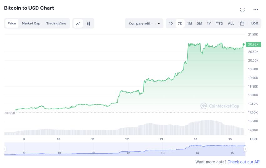 En la última semana, el precio de Bitcoin ha oscilado entre los 18,000 y los 21,000 dólares, mostrando una recuperación repentina de hasta 25,9%, lo cual impulsó el mercado cripto a un promedio del 10%, siendo que hasta el pasado 11 de enero, BTC no superaba los 17,500 dólares, siendo su precio habitual en los últimos meses, de acuerdo con CoinMarkeCap.