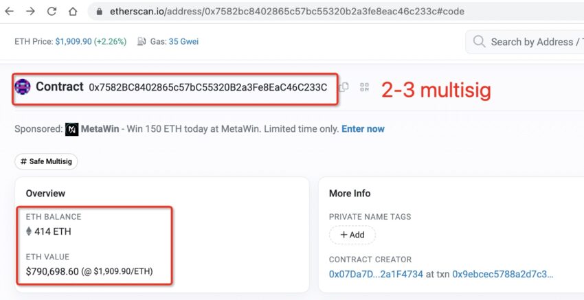 PeckShield informó que un monedero de dos o tres firmas múltiples administra los fondos devueltos. Más interesante aún, parece que el valor de la recompensa es de aproximadamente 98,000 dólares para Tornado Cash.