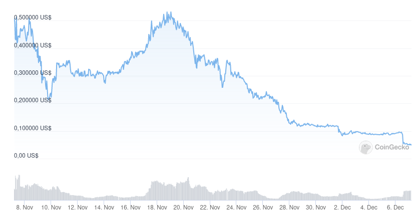 Desde entonces ha experimentado un aumento mínimo y cotiza en 0.048 dólares, según los datos de CoinGecko. Esta cifra representa una caída abrupta del 90% en los últimos 30 días.
