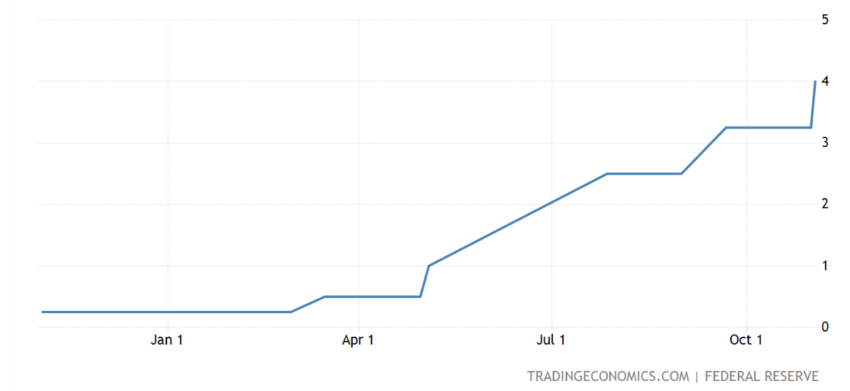 La Fed elevó las tasas de interés en 0,25% en marzo de 2022, la primera subida desde 2018. En su reunión de política monetaria de marzo, predijo seis subidas más, que desde entonces se han cumplido. En mayo, el banco central continuó con su política de endurecimiento económico al anunciar el primer aumento del 0,5 % desde 2000. Los cuatro aumentos restantes, junio, julio , septiembre y ahora noviembre, fueron todos del 0,75%.