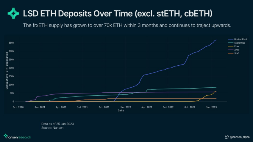Los datos de Nansen muestran que el valor total bloqueado (TVL) en Frax Ethereum ha crecido un 77% en el último mes para superar los 140 millones de dólares, lo que lo convierte en el LSD de más rápido crecimiento.