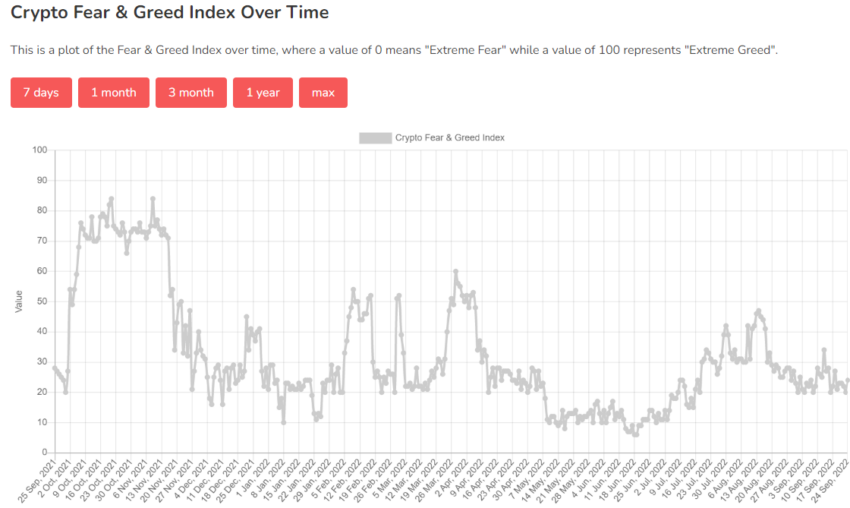 Según el índice Fear & Greed, el sentimiento actual del mercado permanece relativamente sin cambios en comparación con el mes pasado. El sentimiento actual se ubica en 24 de 100, poniendo el sentimiento actual como “Miedo extremo”. El índice solo alcanzó un máximo de 60 en 2022. En comparación con 2021, cuando alcanzó 95 en febrero y 84 en octubre.