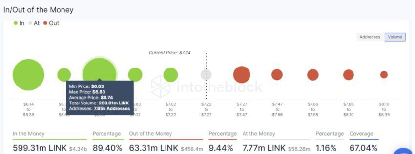 Un análisis de su precio sugiere que esto es posible. Las perspectivas del modelo IOMAP de IntoTheBlock muestran que más de 7,500 direcciones compraron 290 millones de tokens al negociar entre 6,63 y 6,83 dólares.