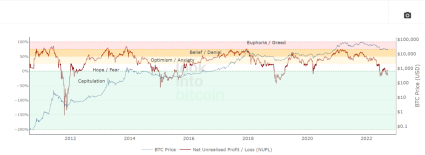 Mirando las estadísticas actuales de ganancias/pérdidas netas no realizadas (NUPL), es evidente que el clima actual del mercado está en un estado de capitulación después de un mercado bajista prolongado. NUPL representa datos en cadena que muestran si el mercado está en un estado de ganancias o pérdidas.