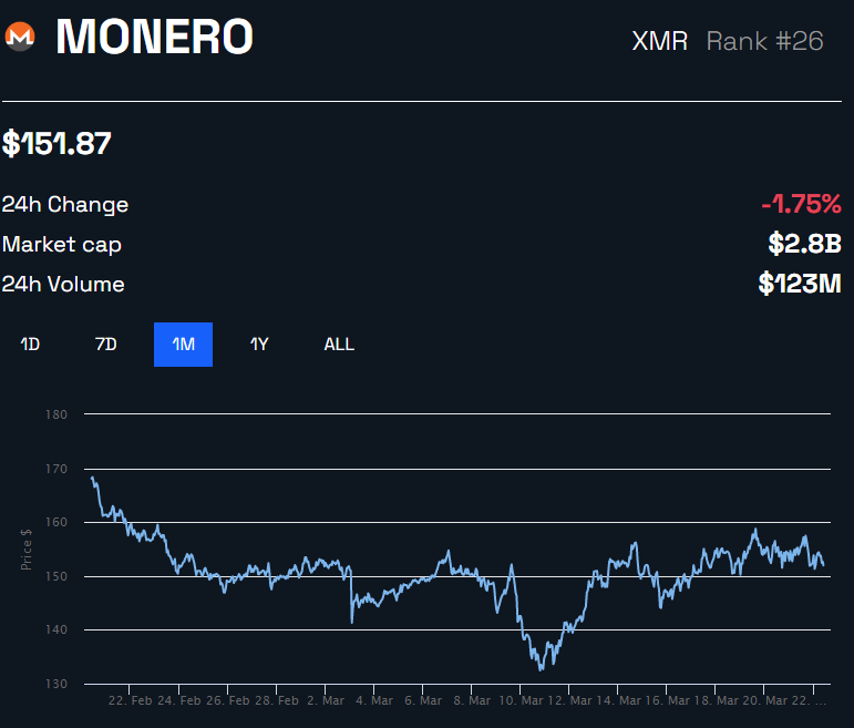 En el momento de la publicación, el token XMR centrado en la privacidad de Monero se cotiza a 152 dólares tras un desempeño moderado esta semana.