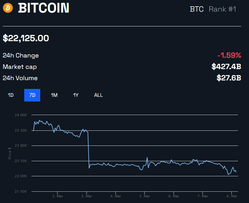 Los mercados han respondido cayendo un 1.3% hasta los 1,06 billones de dólares en capitalización total. Además, BTC ha caído un 1.6% en el día, cotizando a 22,125 dólares en el momento de la publicación.