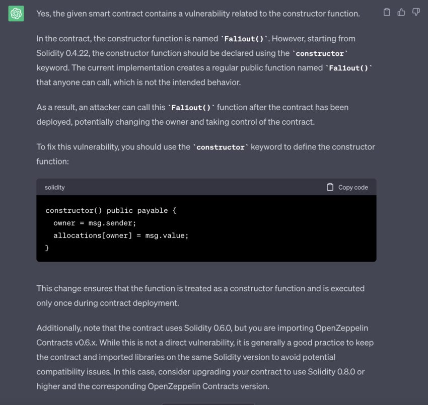 OpenZeppelin demostró que la IA de OpenAI es buena para mostrar vulnerabilidades de seguridad, pero no es efectiva para reemplazar a un humano. GPT-4 no pudo solucionar los niveles del juego de 24 a 28 apunta más a los datos de entrenamiento de ChatGPT, lo cual hace suponer que los niveles que ha fallado es por un aprendizaje de soluciones incorrectas.