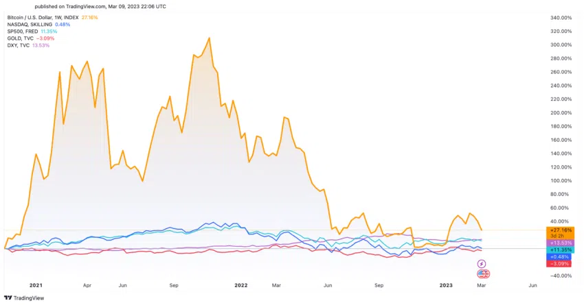 Históricamente, Bitcoin no ha estado correlacionado con el mercado de valores. Sin embargo, en los últimos años ha habido una creciente correlación entre Bitcoin y el mercado de valores, particularmente en tiempos de incertidumbre económica. Y sí, son tiempos inciertos ahora.