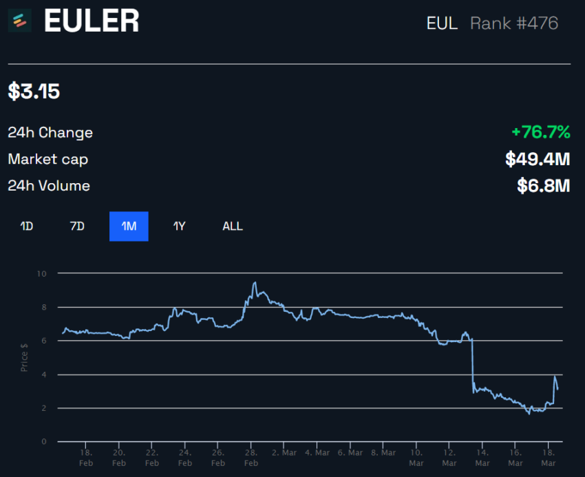 El token EUL de Euler Labs ha subido más del 76% en las últimas 24 horas a 3.15 dólares al momento de escribir este artículo, según datos de BeInCrypto. El token EUL se había desplomado en más del 48% tras el exploit del 13 de marzo.