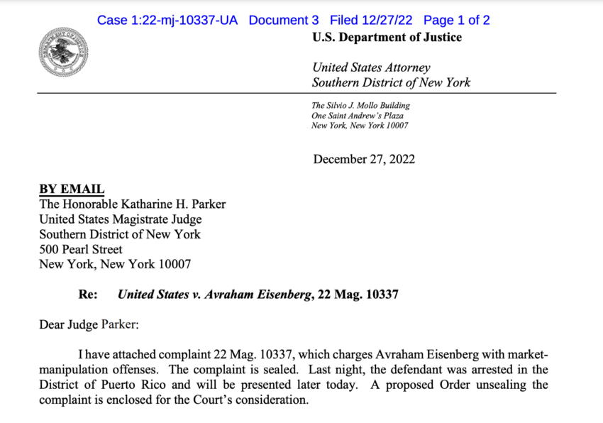 “Adjunto denuncia 22 Mag. 10337, que acusa a Avraham Eisenberg de delitos de manipulación del mercado. La denuncia está sellada. Anoche, el imputado fue detenido en el Distrito de Puerto Rico y se presentará más tarde hoy. Una Orden propuesta que abre el. Se adjunta denuncia para consideración del Juzgado”.
