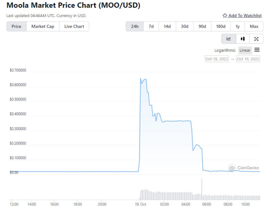 El precio MOO ha vuelto a los niveles previos al exploit para cotizar en 0.018 dólares. Ha perdido el 99% de su valor desde su precio máximo de septiembre de 2021 de poco más de 3 dólares.