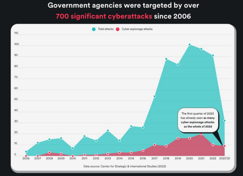 En el primer trimestre de 2023, los hackers se dirigieron a agencias gubernamentales 32 veces y nueve de estos incidentes se clasificaron como espionaje.