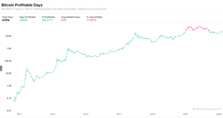 Específicamente, las métricas señalan que Bitcoin registra una rentabilidad del 88.51% desde el año 2011. Para exponer datos más específicos, el precio de BTC ha experimentado 4,068 días con ganancias.