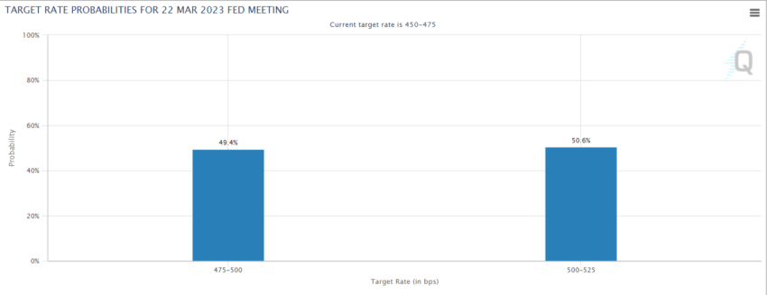 A principios de esta semana, los operadores asumieron que la Fed aumentaría la tasa de los Fondos Federales, que se ubica 4.57%, en 50 puntos básicos en la próxima reunión del Comité Federal de Mercados Abiertos. El presidente Jerome Powell reforzó esta línea de pensamiento en discursos a principios de esta semana.