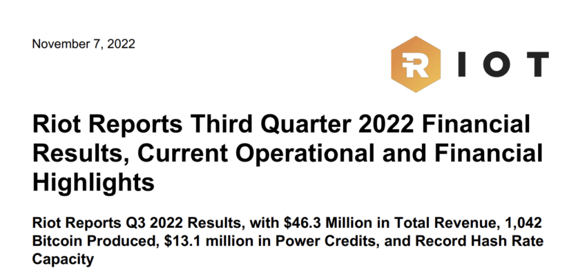Riot Blockchain Inc. el 7 de noviembre publicó sus resultados financieros del tercer trimestre de 2022 en su sitio web oficial. Es justo decir que los ingresos se habían desplomado en comparación con el año anterior. Esto llega en un momento en que la minería de Bitcoin ya no es rentable.
