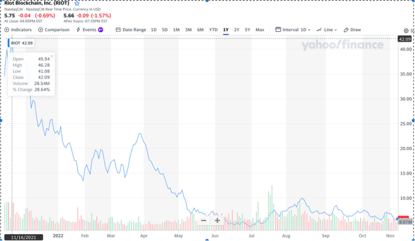 Las acciones de las empresas mineras estaban recibiendo un fuerte golpe. Al escribir, las acciones de Riot (RIOT) cayeron alrededor de 2%, ya que cotizaban a alrededor de 5,75 dólares. De hecho, una caída masiva al mismo tiempo el año pasado; se negoció a 42,09 dólares en Yahoo Finance (una caída de> 80%).