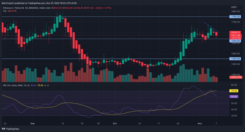 El precio de Ethereum (ETH), después de registrar un máximo de varias semanas de 1,680 dólares, ha comenzado su viaje descendente. ¿Están los bajistas listos para tomar el control y empujar la acción del precio al nivel de soporte más bajo?