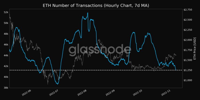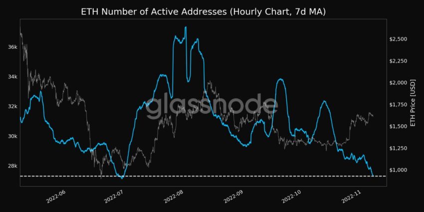 Una de las razones detrás del debilitamiento del impulso de los precios de ETH fue la disminución del número de direcciones activas. Los datos de Glassnode mostraron que el número de direcciones activas de Ethereum (7d MA) alcanzó un mínimo de cuatro meses de 27,303.357 el 7 de noviembre.