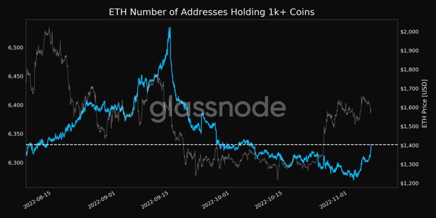 Sin embargo, la acumulación de ballenas con más de 1,000 monedas continuó en el mercado. En particular, el número de direcciones de Ethereum con más de 1,000 monedas alcanzó un máximo de un mes en 6,331.