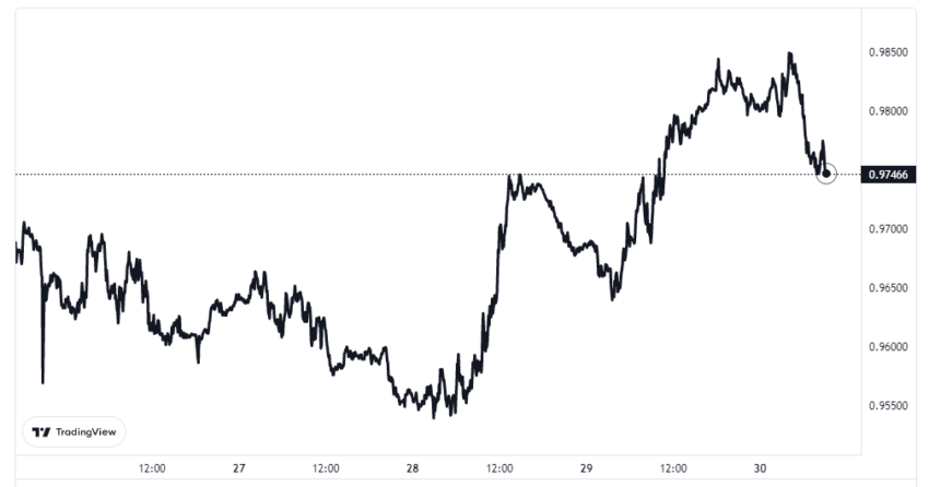 El euro llegó a cotizar en 0.95 dólares. Sin embargo, ha experimentado un leve repunte y actualmente se encuentra en los 0.975 dólares, según los datos de TradingView.