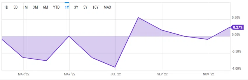 En un día bajista, Bitcoin subió al punto de equilibrio en 16,791 dólares después de cotizar entre 16,500 y 17,500 dólares durante la mayor parte del mes anterior. ADA subió un 1,91% a 0,2716 dólares, mientras que Ethereum se mantuvo más o menos estable en 1,251 dólares.