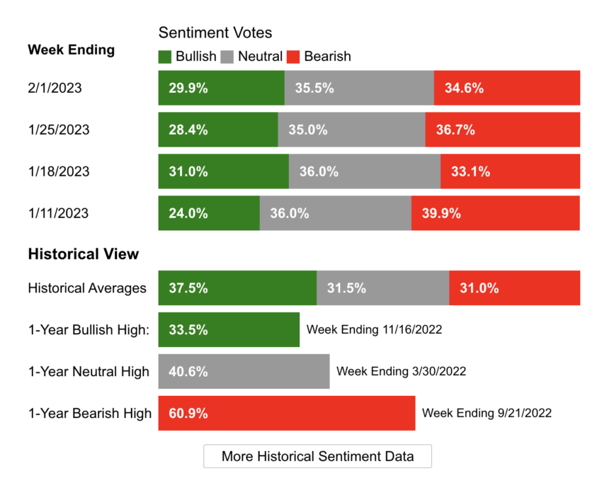 La encuesta semanal de sentimiento de los inversores de la AAII también indica que los inversores son bajistas con respecto a las acciones. De hecho, los encuestados bajistas superaron a los encuestados alcistas en un 36,7% frente a un 28,4%.