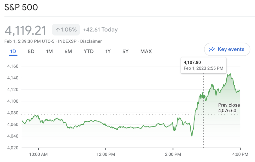 Curiosamente, el S&P 500 alcanzó un máximo de $4150 el miércoles 1 de febrero, luego de una declaración del presidente de la Reserva Federal, Jerome Powell, que insinuaba que la tendencia desinflacionaria en la economía había comenzado.