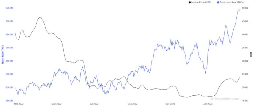 El hashrate de la red alcanzó un máximo histórico de 318 exhashes por segundo (EHs) esta semana, según Blockchain.com. Actualmente se encuentra justo por debajo de esos niveles después de aumentar un 25% desde principios de este año.