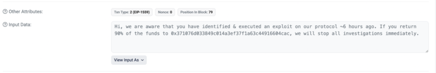 El equipo reconoció el exploit y envió una nota on-chain al hacker, pidiéndole que devolviera el 90% de los fondos.