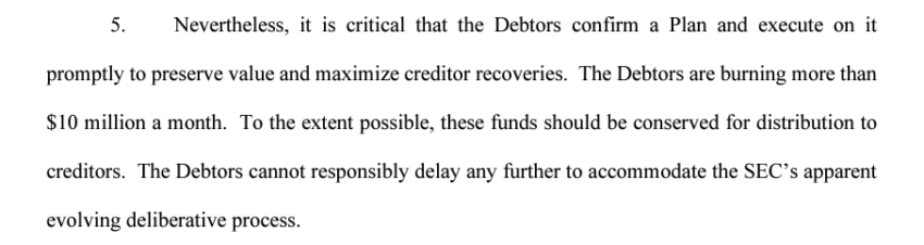 “La verdad es que la distribución no podría, por ley, considerarse verdaderamente una oferta de valores no registrada porque es una distribución que se realiza en un proceso judicial de bancarrota. Pregúntese, ¿a quién protege la SEC aquí? Ciertamente no son los inversores”.