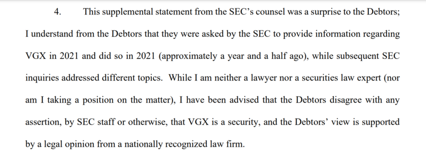 También negó las acusaciones del personal de la SEC de que el token VGX de Voyager era un valor, citando divulgaciones anteriores que la empresa hizo a la SEC a pedido. Además, afirmó que abogados “reconocidos a nivel nacional” habían confirmado que VGX no era un valor.