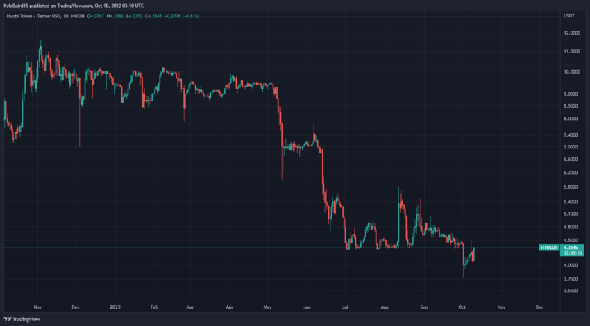 El token nativo de Huobi, HT, se ha disparado en las últimas tres horas, subiendo un 5% para negociarse a 4.30 dólares en el momento de escribir este artículo, según CoinGecko.