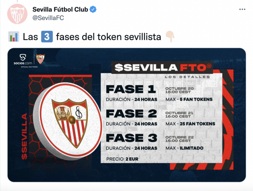 Las tres fases de venta del $SEVILLA durarán 24 horas y se realizarán entre el 20 y el 22 de octubre y se prevé la venta de 50,000 fan tokens a nivel mundial. Cada uno tendrá un costo de 2 euros. Los aficionados podrán adquirirlos en la aplicación de Socios.com.