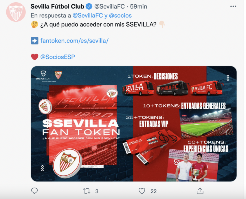 A principios de año, Sevilla FC anunciaba su alianza con Chiliz, para lanzar su fan token $SEVILLA, a través de la plataforma Socios.com, con el que prometió a los aficionados del Sevilla FC disfrutar de diversas promociones y obtener descuentos exclusivos en varios accesorios y conjuntos deportivos del club, que prometió lanzar junto con una encuesta de participación.